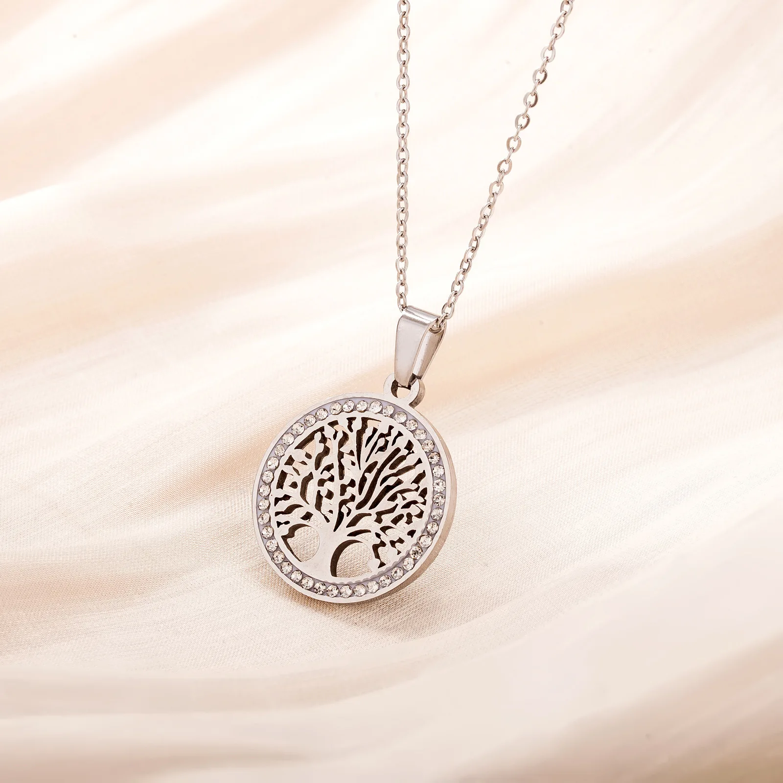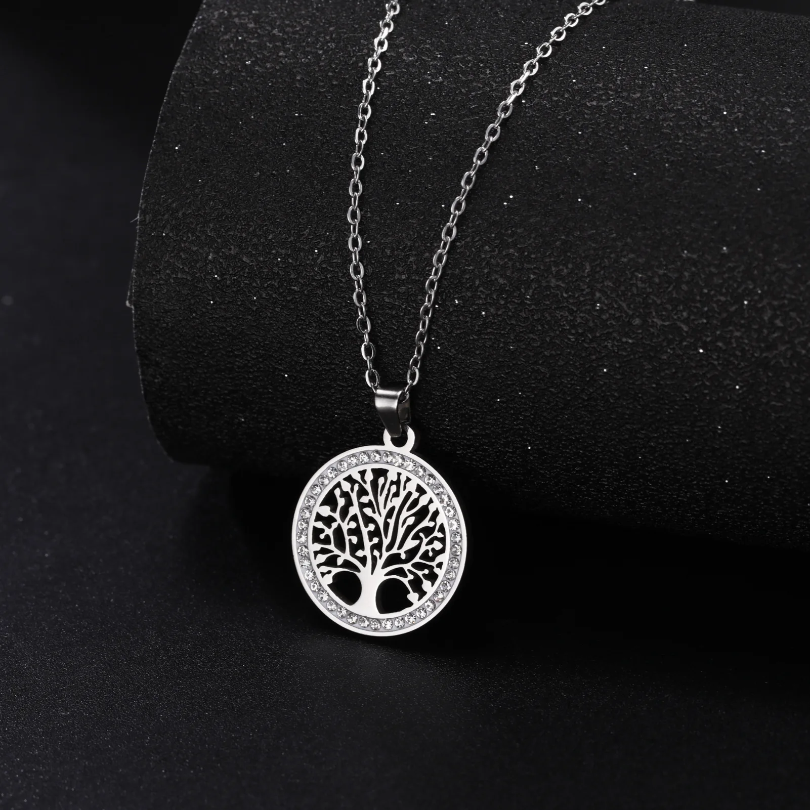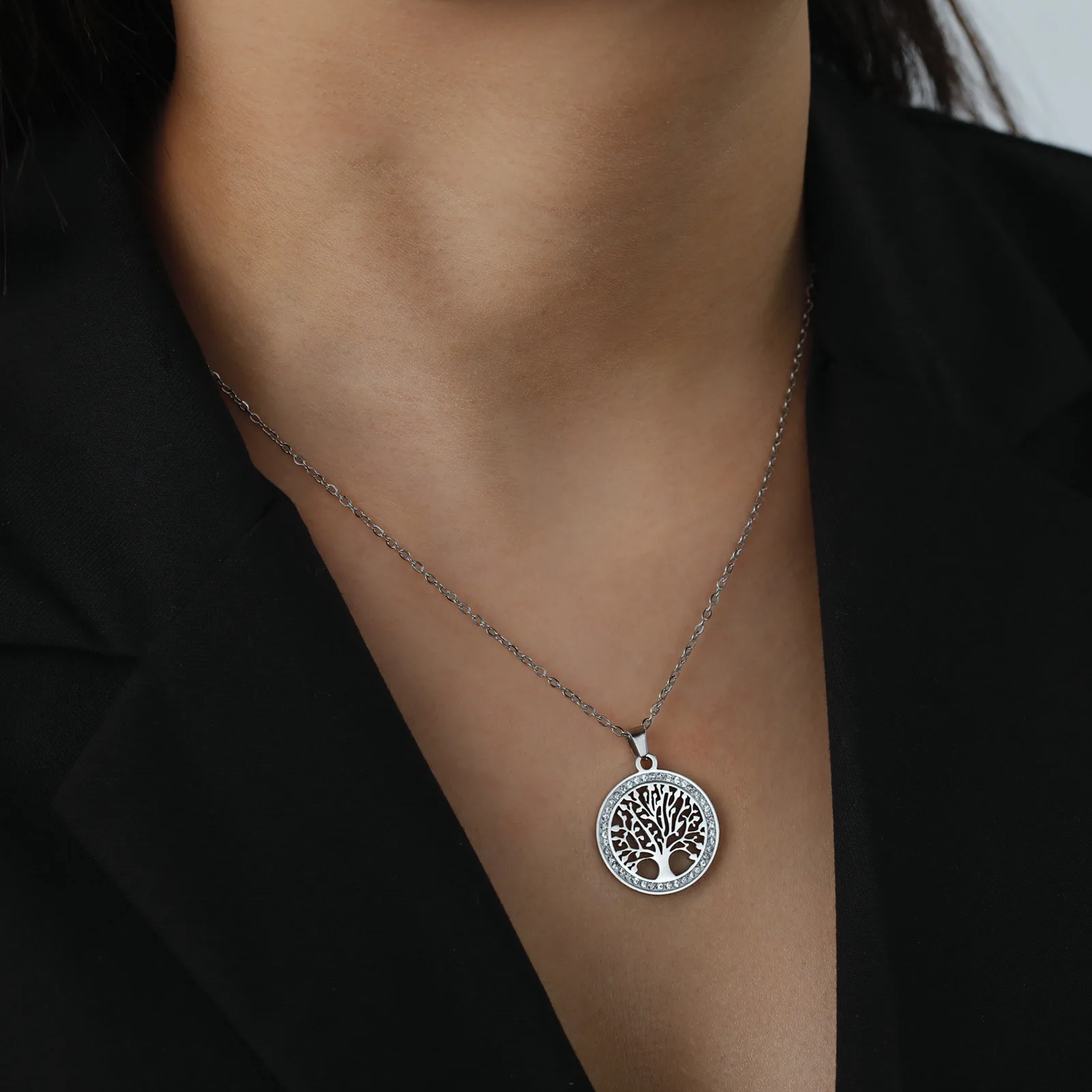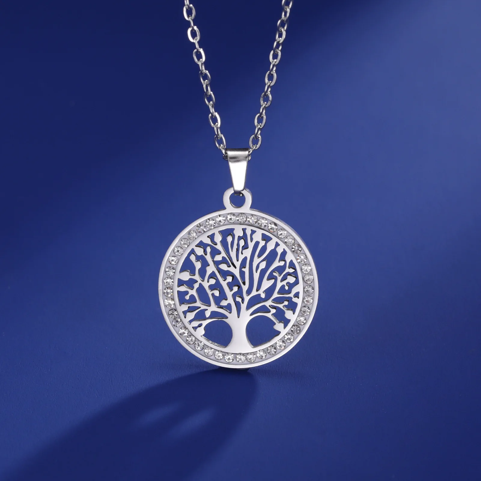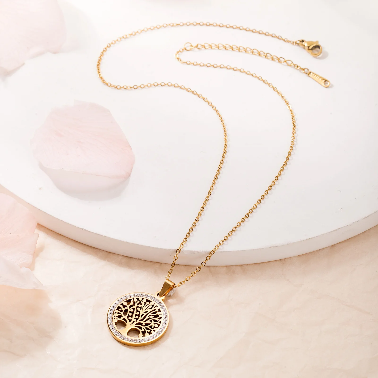 Women's Stainless Steel Gold-Color Tree of Life Necklace with Clear Zircon round Pendant Luxury Jewelry Gift for Weddings